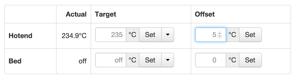 In the example below, we entered an offset value of 5 and then pressed the "Set" button. This resulted in the Target temperature of 235, when we printed an object that with sliced using the built-in slicer.